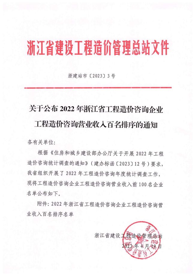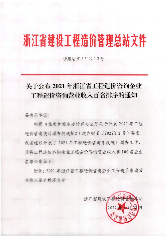 2022年浙江省工程造价咨询开云网页版登录入口工程造价咨询营业收入百名