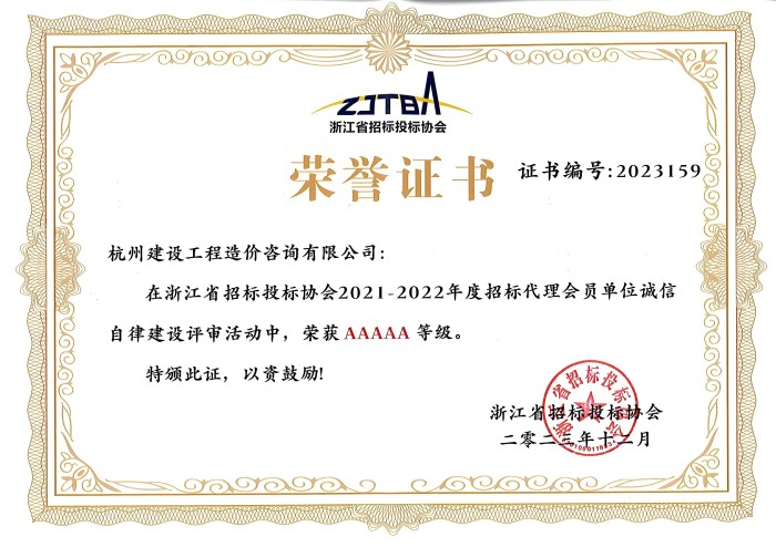 浙江省招标投标协会2021-2022年度招标代理会员单位诚信自律建设AAAAA