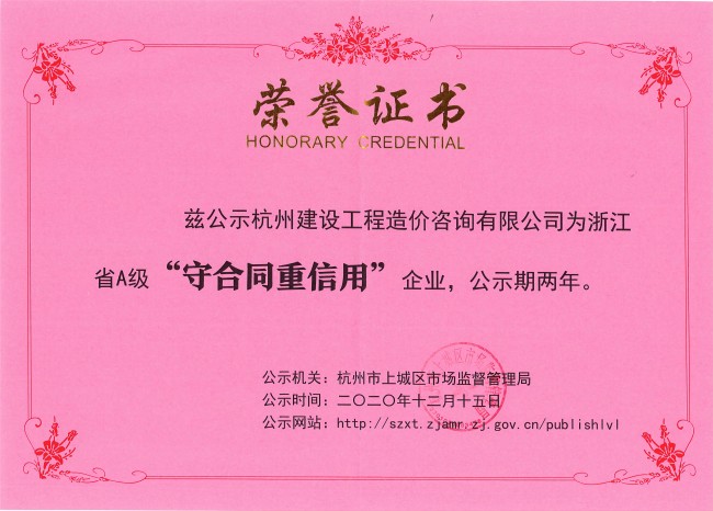 2020年度浙江省A级“守合同重信用”开云网页版登录入口