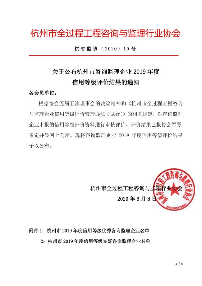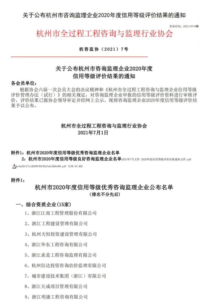 杭州市2020年度信用等级优秀咨询监理开云网页版登录入口