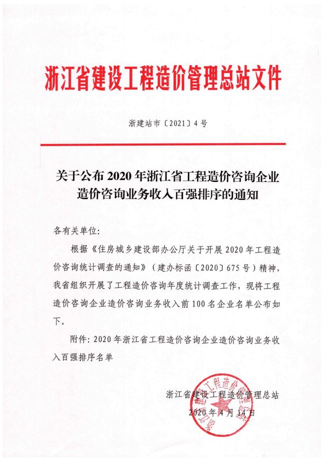 2020年浙江省工程造价咨询开云网页版登录入口造价咨询业务收入百强