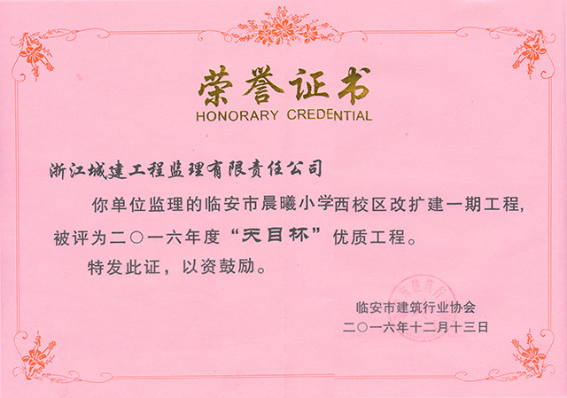 2016年临安市晨曦小学西校区改扩建一期工程被评为“天目杯”优质工程