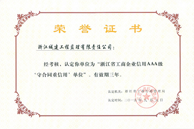 2015年浙江省工商开云网页版登录入口信用AAA级“守合同重信用”单位