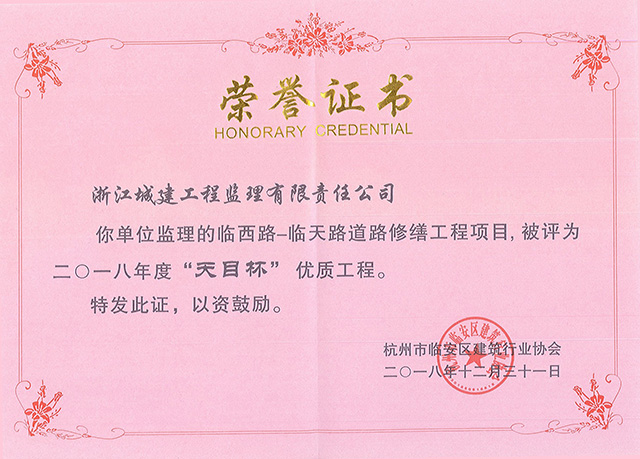 2018年临西路-临天路道路修缮工程项目被评为“天目杯”优质工程
