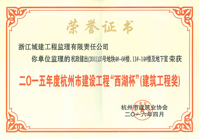 2015年杭政储出(2011)25号地块荣获杭州市建设工程“西湖杯”(建筑工程奖)