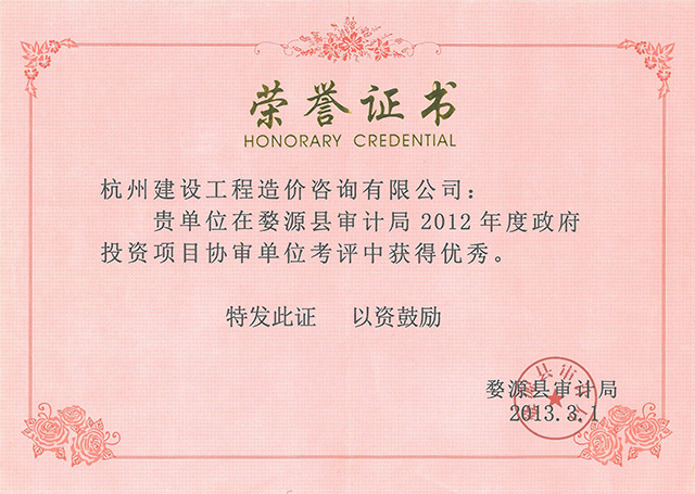 2012年婺源县审计局政府投资项目协审单位考评优秀