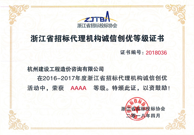 2016-2017年浙江省招标代理机构诚信创优AAAA等级