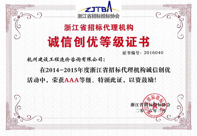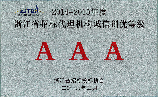 2014-2015年浙江省招标代理机构诚信创优AAA等级