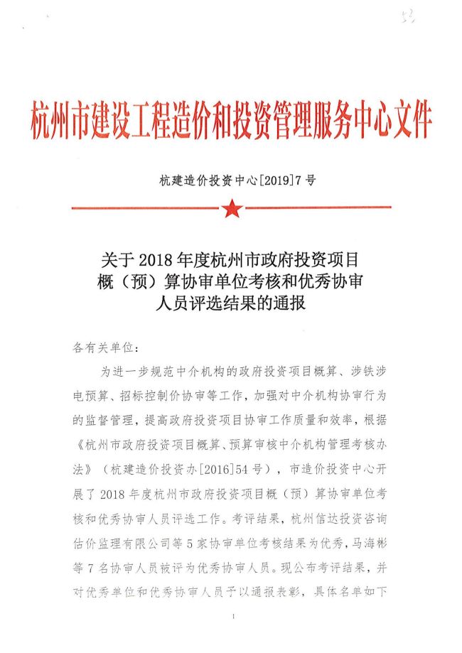 2018年度杭州市政府投资项目概(预)算优秀协审单位