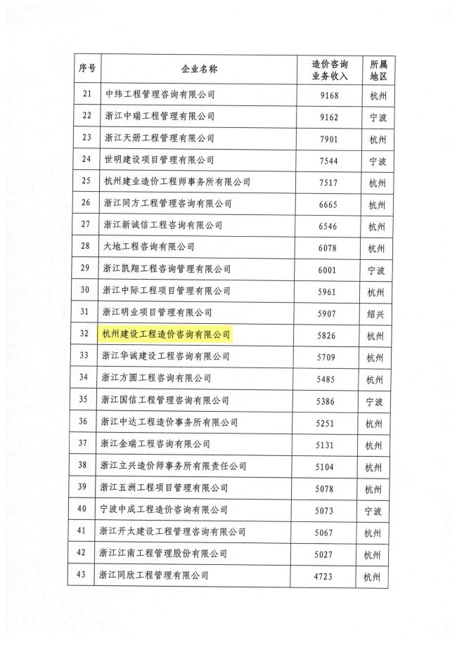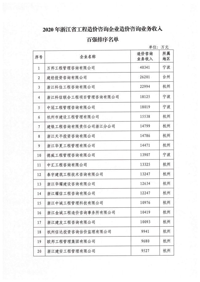 2020年浙江省工程造价咨询开云网页版登录入口造价咨询业务收入百强