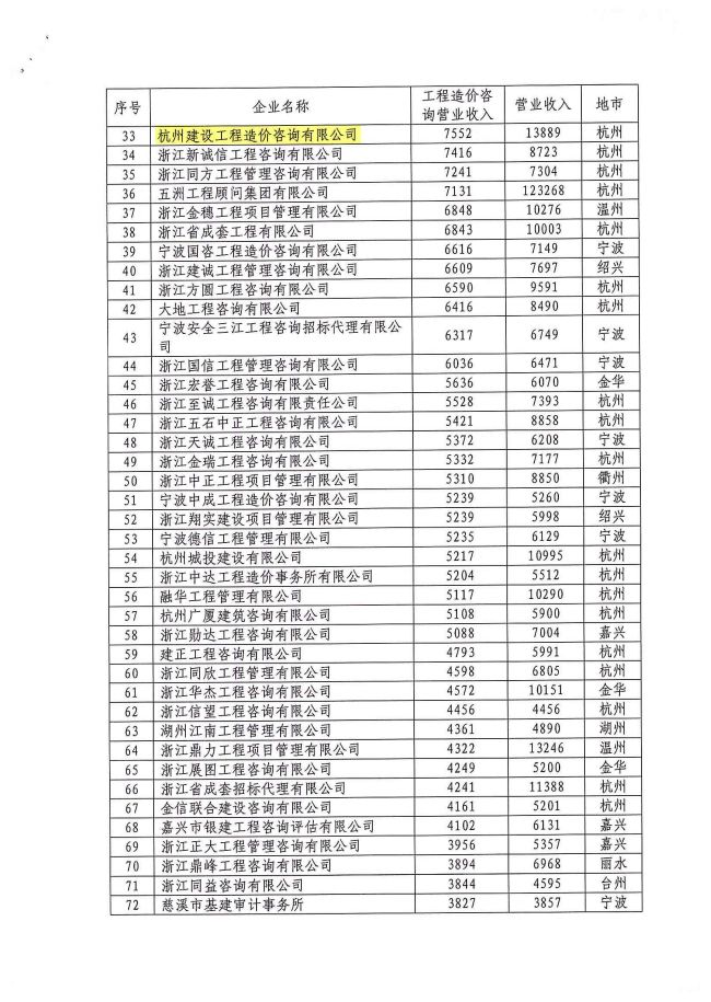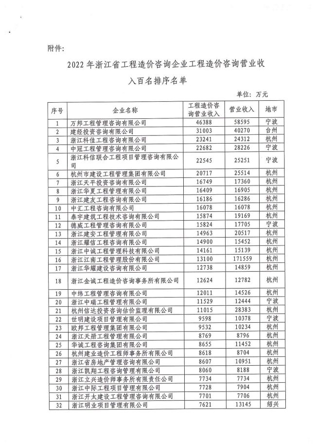 2022年浙江省工程造价咨询开云网页版登录入口工程造价咨询营业收入百名